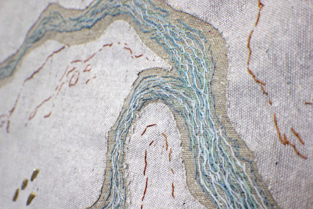 En el bordado aparecen seres y señales del desierto que resisten al extractivismo, como visiones que brotan del pasado, dibujados en la tierra herida, brillan y se mimetizan con el paisaje fragmentado que desaparece poco a poco. Inspirados en geoglifos, petroglifos y pinturas rupestres diaguitas, estos seres acompañan los ríos y cuidan las tierras, siendo testigos de las violaciones que cometen cotidianamente hombres extranjeros, en la oscuridad de la impunidad.