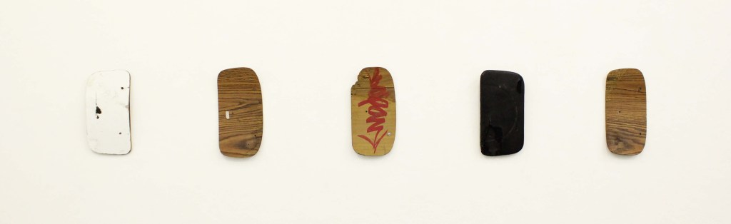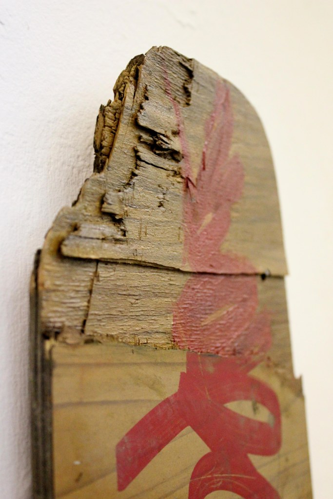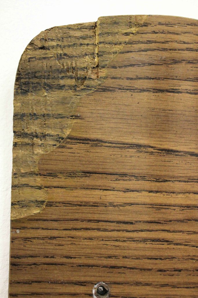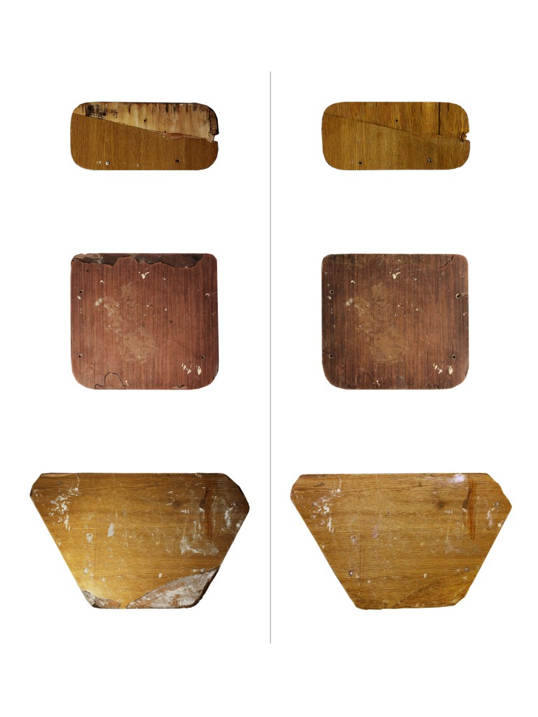Fueron pintados con óleo aquellos sectores de los objetos en que el recubrimiento plástico se había salido previamente. La intervención pictórica actúa sobre la madera cruda continuando vetas, dibujos y rayados del enchapado de madera, simulando las vetas e imitando el color. De la misma forma, intenta restaurar los objetos de manera superficial e inútil, disimulando la precariedad evidenciada en la corrosión y podredumbre de ellos.