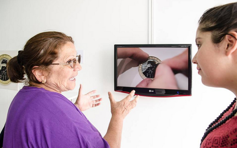 Intervención – Acción a partir de una moneda de 100 pesos chilena, que con plumón negro «encapucha» la cara de una mujer mapuche vestida tradicionalmente. Obra en proceso que se completa en la interacción con el público y la comunidad.