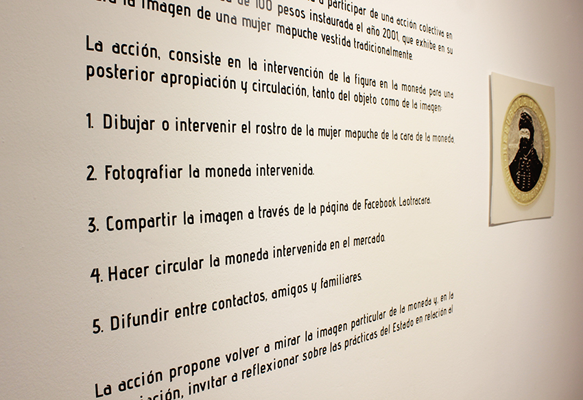 En un principio se trata de una instalación; la exhibición de una moneda de cien pesos intervenida con plumón negro, enmarcada. Debajo, una repisa o caja sostiene una variedad de plumones negros. Se expone además, un video que grafica la intervención sobre la moneda y un texto con una invitación. La imagen de la moneda intervenida se expone en todos los medios posibles, casi como una estrategia publicitaria. En una segunda instancia, se trata de una acción, de la cual el público será el protagonista. La invitación sugiere la intervención de tu propia moneda para un posterior registro fotográfico y difusión mediante el hashtag #laotracara.