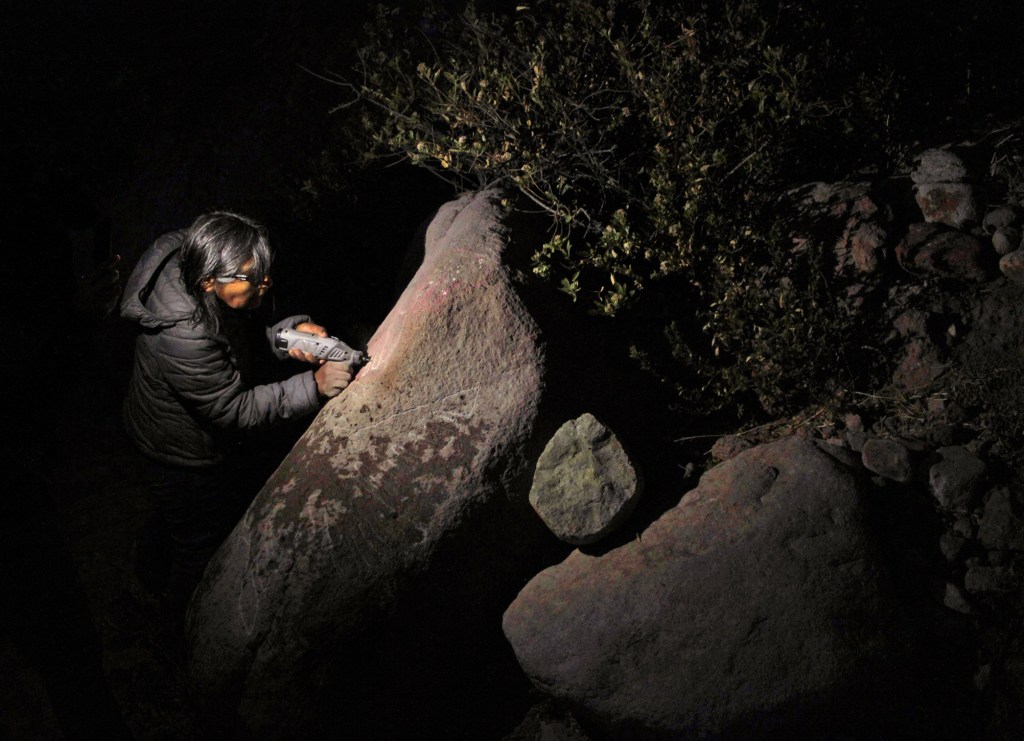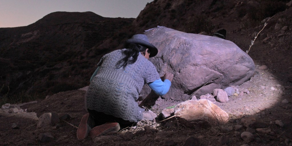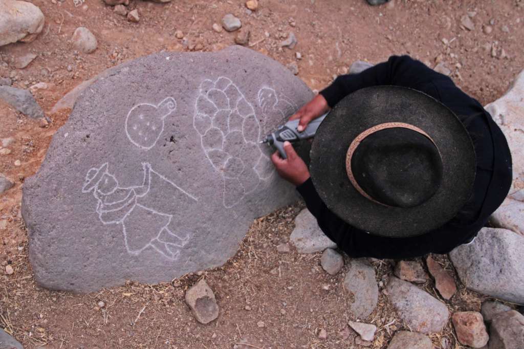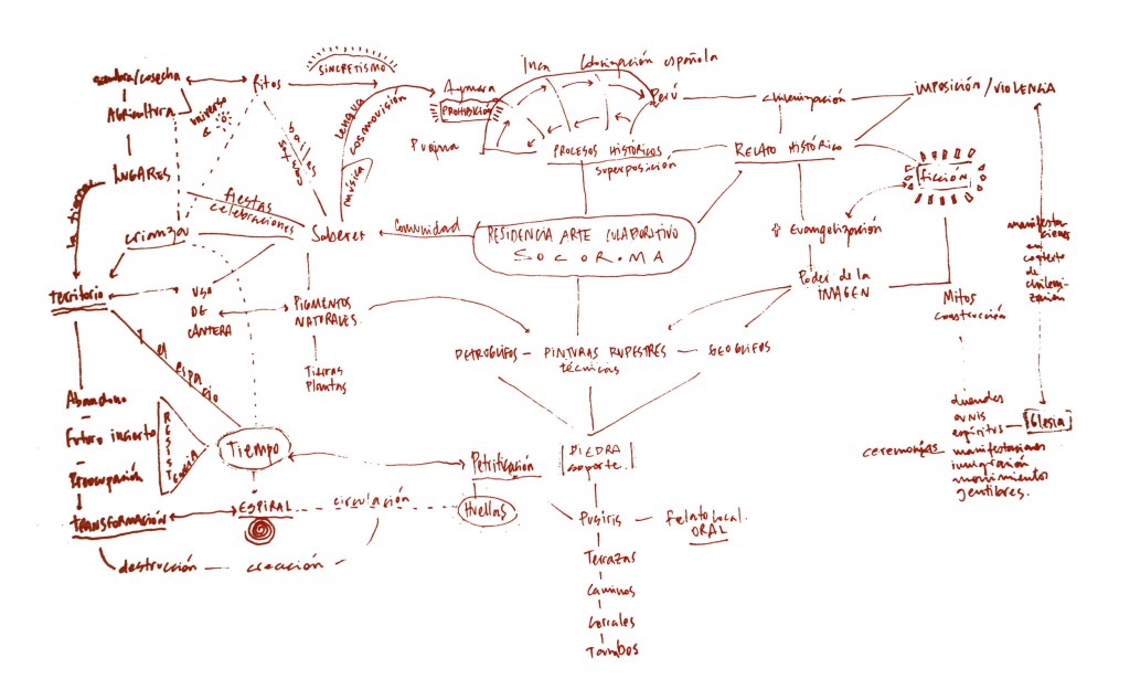 Petrificando Tiempo fue un proyecto de Residencia de Arte Colaborativo desarrollado junto a YY Colectivo, con la colaboración de Tamara Uribe, con quienes nos propusimos problematizar el paso inevitable del tiempo sobre el pequeño poblado de Socoroma, donde habitan alrededor de 25 personas, principalmente adultas mayores Aymara, a 3.000 metros de altura, en la precordillera chilena. Con la intención de dejar huellas colectivas, experimentamos con medios y materialidades del entorno, inspiradas por las pinturas y petroglifos rupestres de la localidad y alrededores, plasmando historias sobre piedras.
