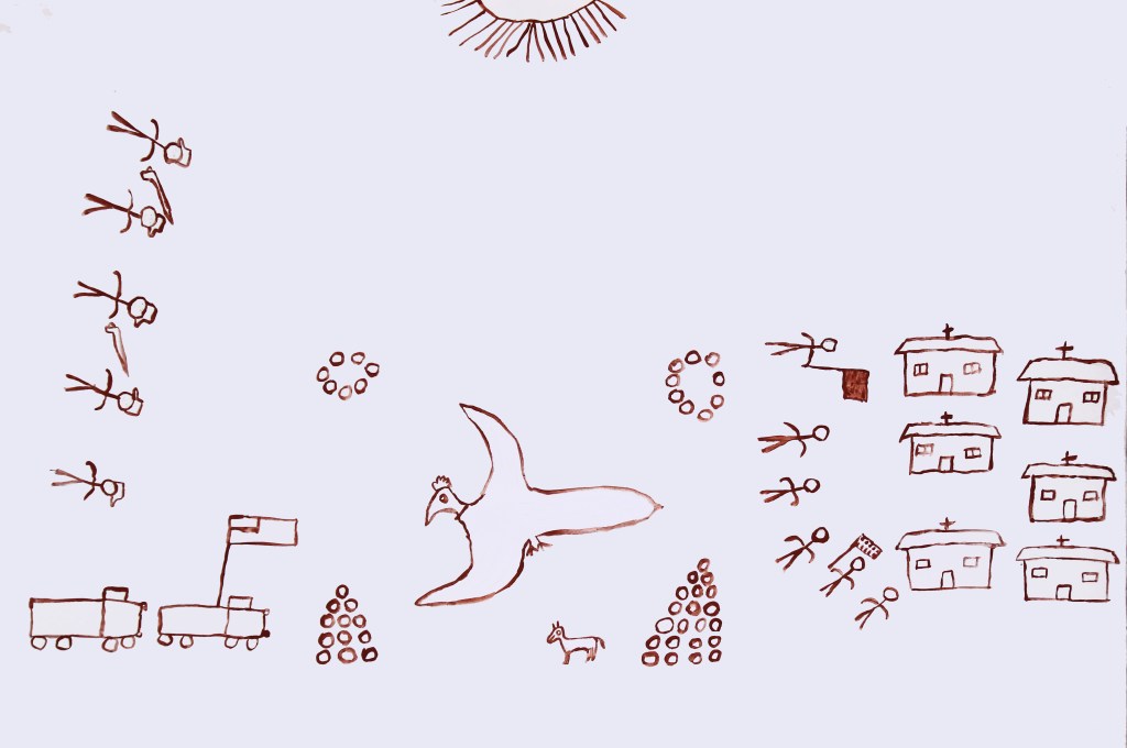 En el marco de un Taller de Dibujo y Creación junto a la comunidad, fuimos abordando diversas temáticas que les interesaban retratar, desde la vida cotidiana, la flora y fauna del territorio, relatos de su cosmovisión andina, fiestas y ceremonias. Durante este proceso, el Estado cedió gran parte de tierras de la comunidad al Ejército de Chile para instrucción y entrenamiento. Esta noticia abrió profundas heridas sociales respecto a la intervención de militares en estos territorios en distintos períodos históricos, desde el proceso de chilenización en el norte grande, a la posterior a la guerra del pacífico, luego durante la dictadura militar y en la actualidad con relatos muy dolorosos del impacto de la presencia militar en Putre (localidad vecina). Tanto a nivel medioambiental, como cultural, en el descuido e intervención directa de sitios arqueológicos que pudimos visitar junto a las participantes y creadoras del proyecto.